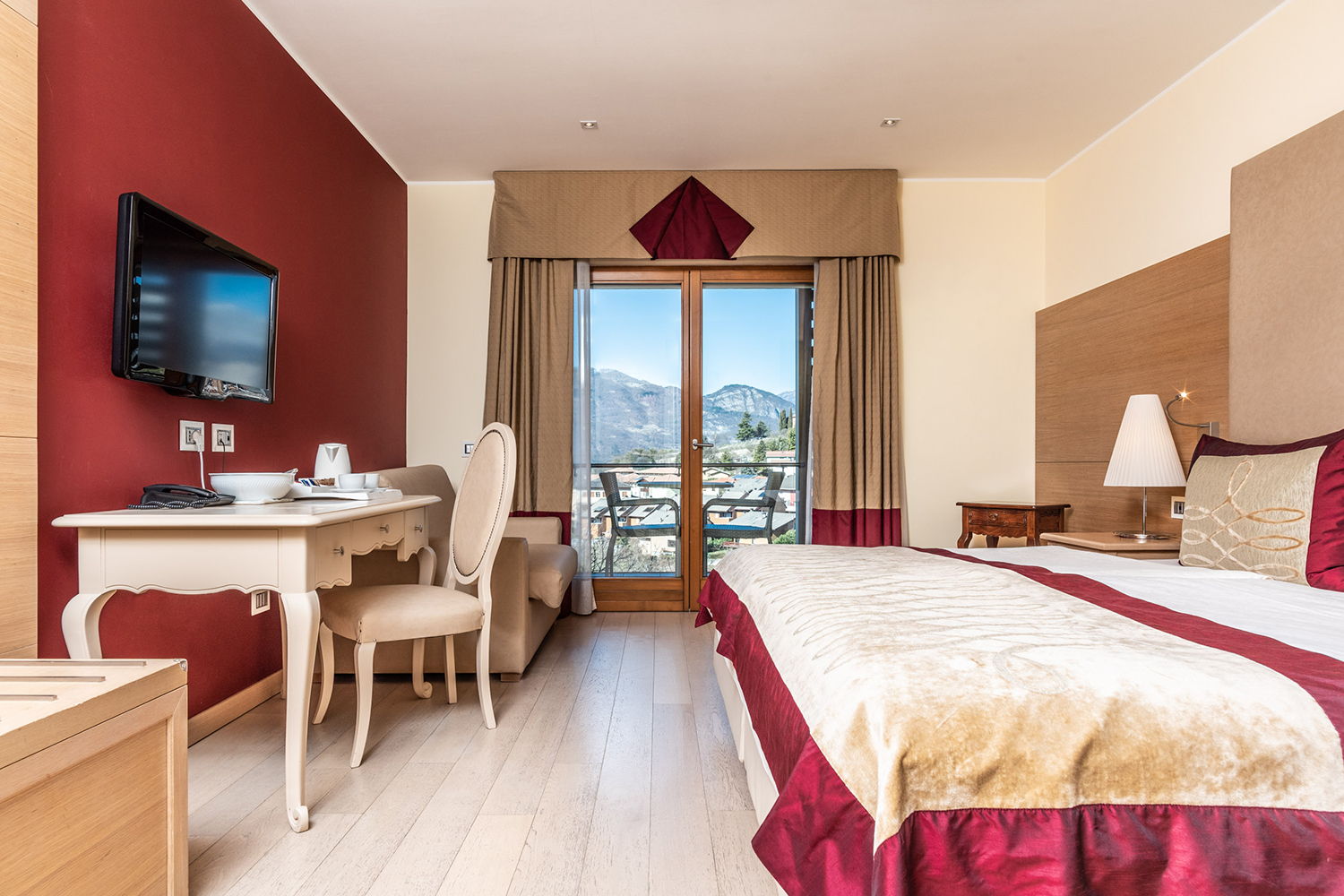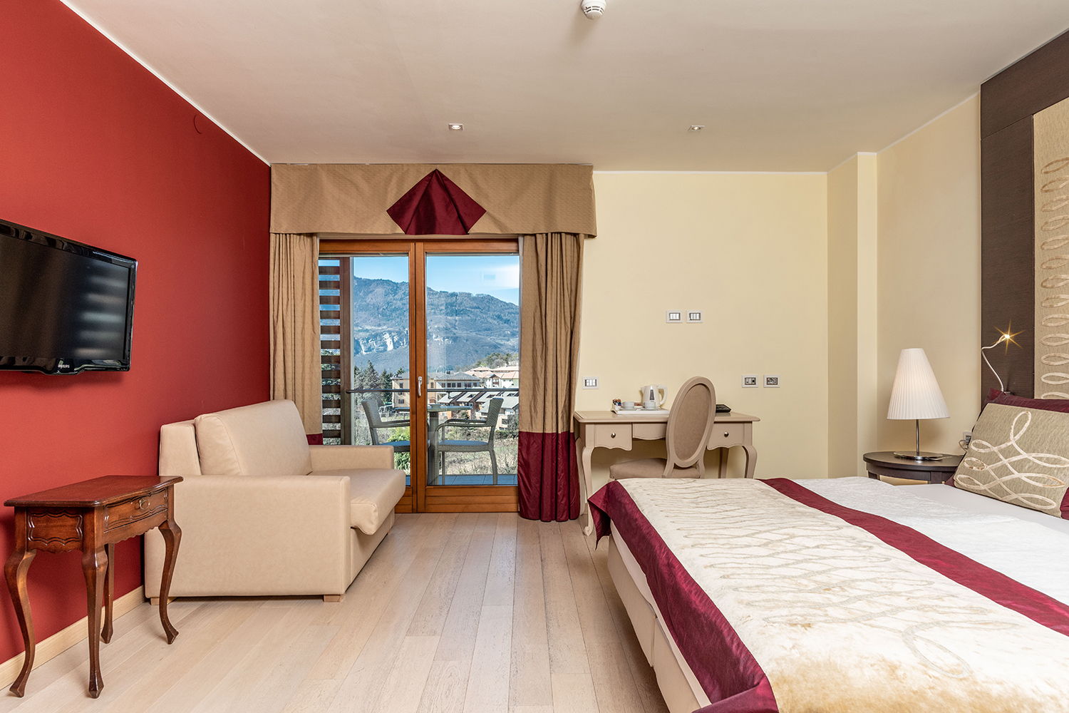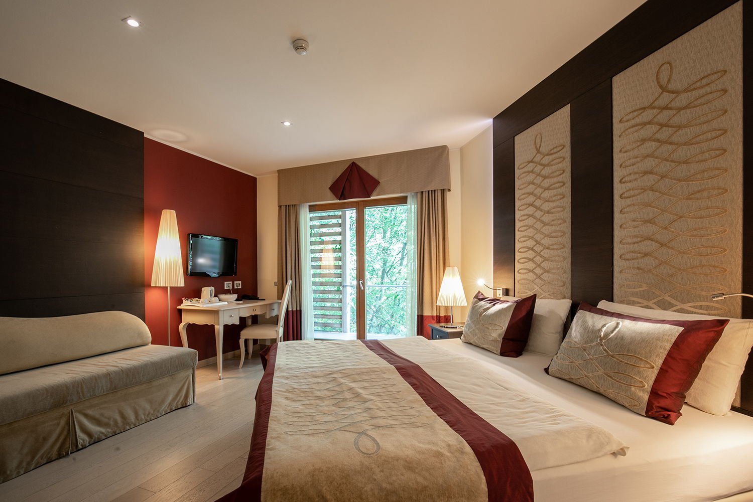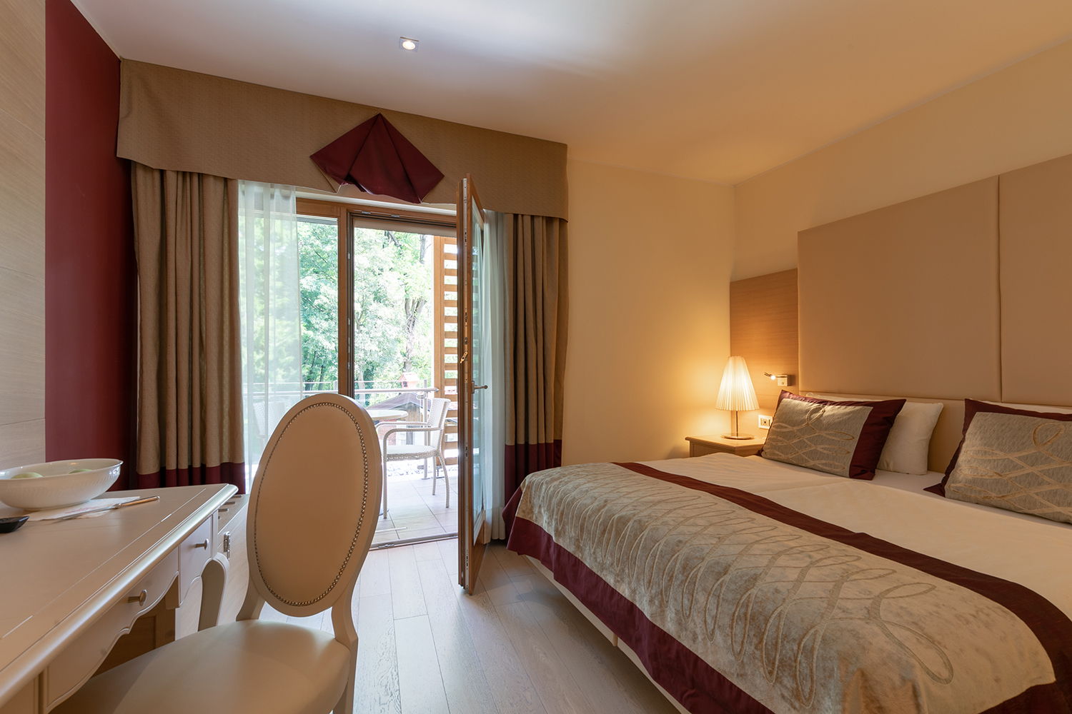 Nell’area Belvedere le camere sono spaziose e confortevoli, arredate con uno stile moderno ed elegante, ma in armonia con il gusto classico di Villa Madruzzo. Questa tipologia di camera è dotata di ampie e luminose finestre che conferiscono agli spazi respiro e calore. Tutte le Belvedere hanno un balconcino privato che si affaccia sul giardino o sul panorama collinare.