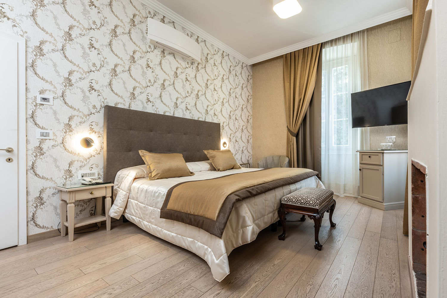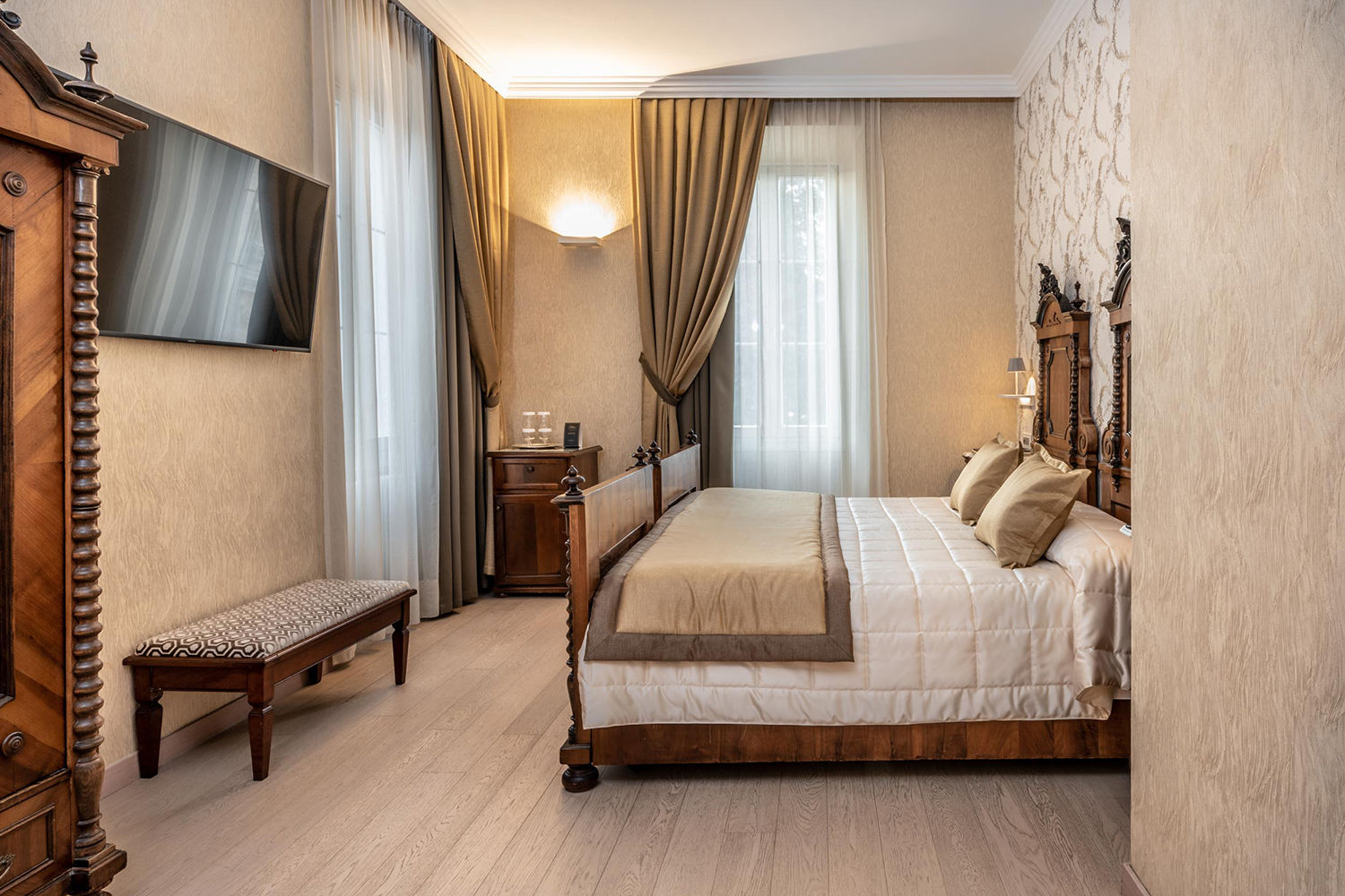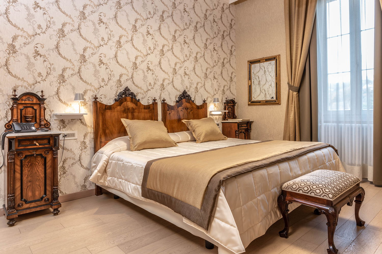 Per questo ogni stanza Madruzzo è unica, per dimensioni, forma e charme: la struttura di queste camere ricalca fedelmente quella originale della Villa, un bene inestimabile che non è stato modificato per mantenerne intatto il valore culturale e storico.