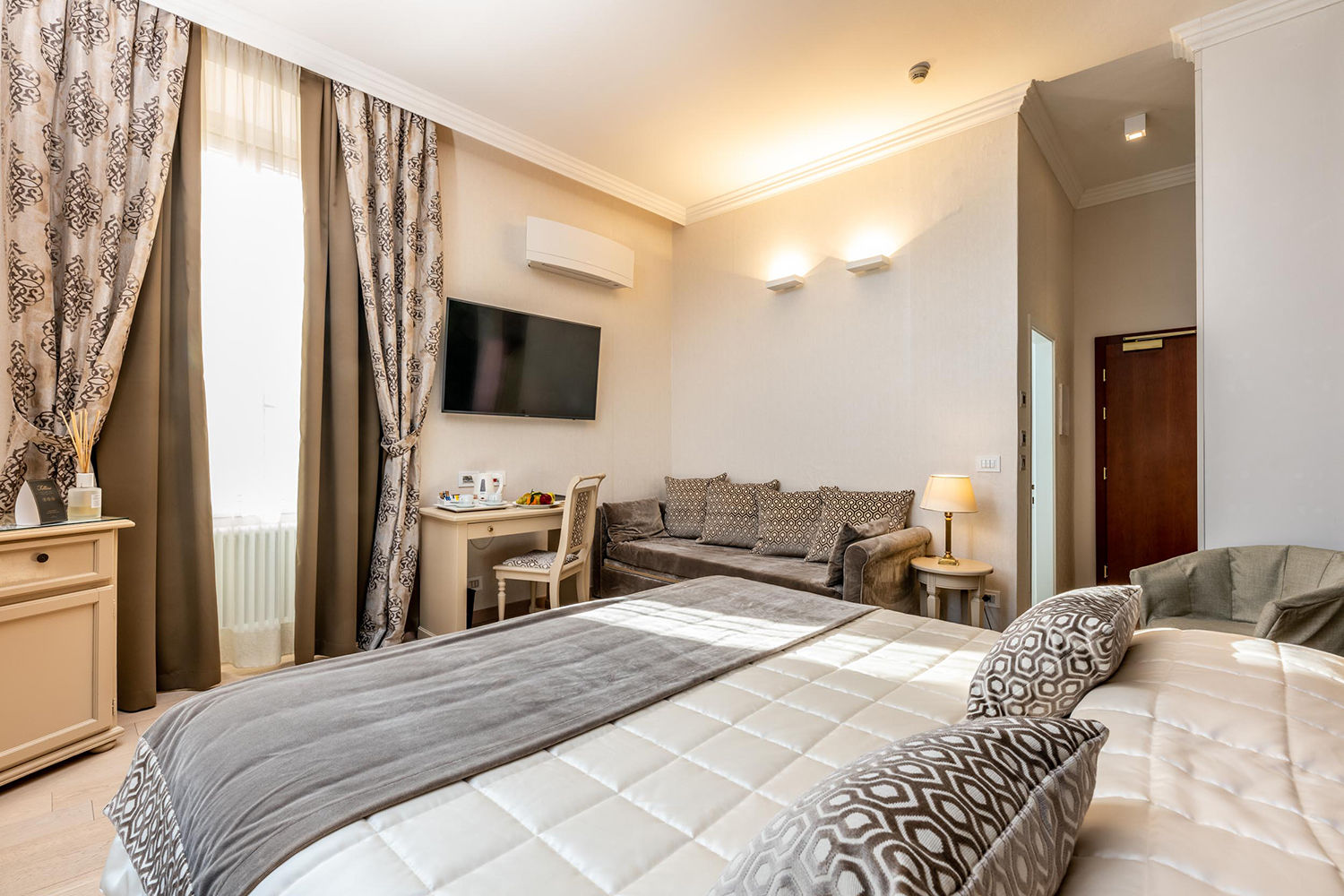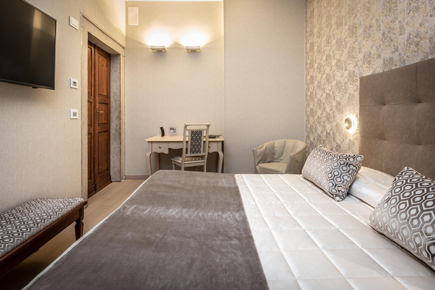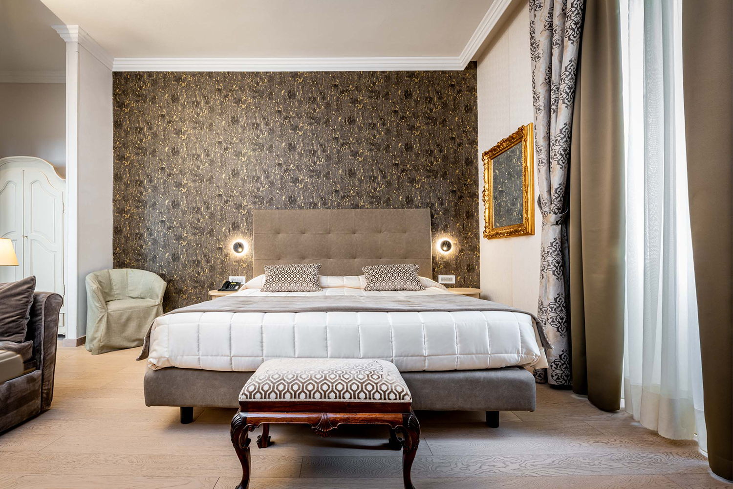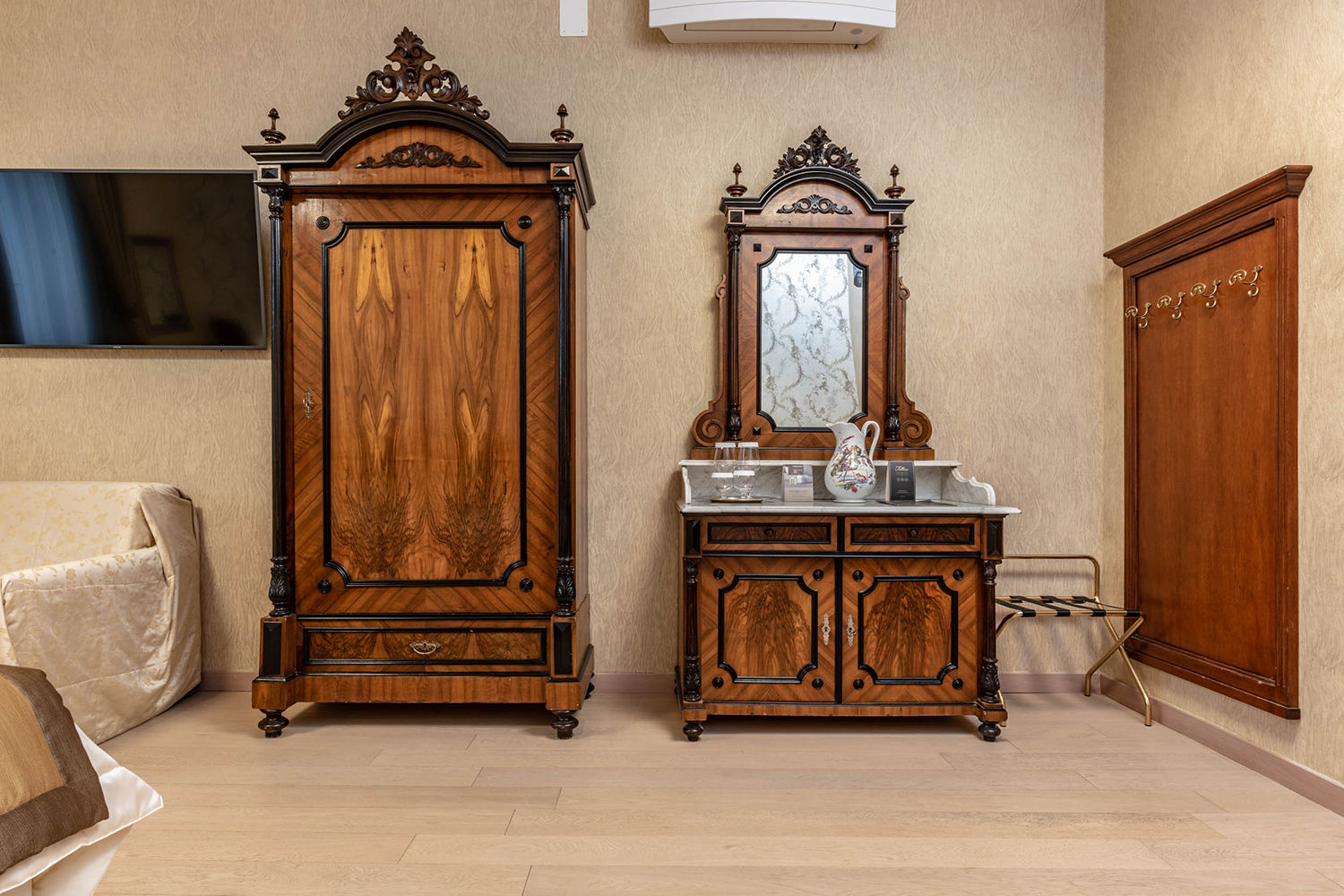 Per questo ogni stanza Madruzzo è unica, per dimensioni, forma e charme: la struttura di queste camere ricalca fedelmente quella originale della Villa, un bene inestimabile che non è stato modificato per mantenerne intatto il valore culturale e storico.