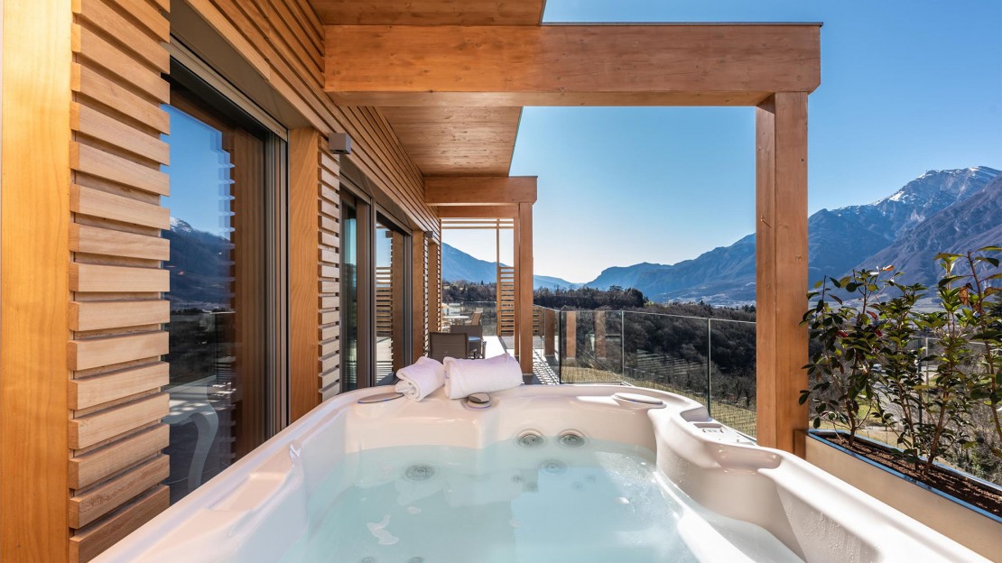 La suite, contraddistinta da un arredamento elegante e ricercato, mette a disposizione tutti i comfort che possiate desiderare per un rilassante soggiorno romantico a Trento: partendo dalla sauna finlandese con vista, all’interno del più grande dei due bagni presenti nella camera, per arrivare alla vasca idromassaggio privata, collocata sulla grande terrazza che circonda la camera e che vi farà immergere in uno spettacolare panorama.